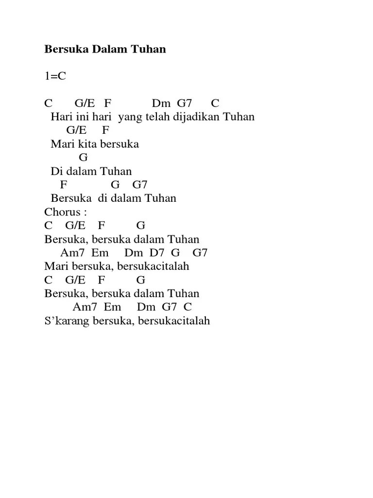 C g f g(2x) g7 c g f g c hari ini hari yang telah dijadikan tuhan g f g7. Hari ini hari yang telah dijadikan tuhan mari kita bersuka Bersuka di dalam tuhan ( bersuka ! Leggi il testo bersuka dalam tuhan di priskila tratto dall'album ada kuasa dalam pujian, vol. Bersuka dalam tuhan am em f g c s'karang bersuka, bersukacitalah.